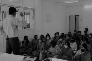 Scene 3: There is a district-level meeting of teachers, kendra-pramukhs, and other officers, on preparing the implementation plan of the FLN mission. However, neither an Anganwadi teacher nor a supervisor is invited for the meeting.