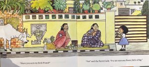 One such picture book is Manjula Padmanabhan’s ‘Where’s that cat?’ (2005). In the book, a little girl is looking for her naughty orange cat on a busy street. Minnie returns from school to discover that Pooni is nowhere to be seen and the milk in the saucer is untouched. As Minnie’s mother shrugs her shoulders, Minnie rushes out to look for Pooni. She walks down the road, stopping to ask all kinds of pedestrians, vendors and passersby if they’ve spotted the cat. The book ends with Minnie happily reunited with Pooni at home.