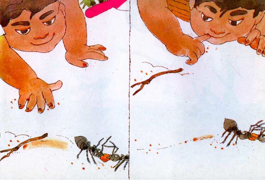 How do these opportunities for windows and mirrors, which offer us glimpses of the world-building in the child, get reflected in the form of the picture book? As discussed in the example that opened this article, Pishi and me, a child is often the central character in a picture book, with illustrations often presenting the story from the child’s perspective. Another excellent example is the boy observing ants in Busy ants by Pulak Biswas (Figure 02).