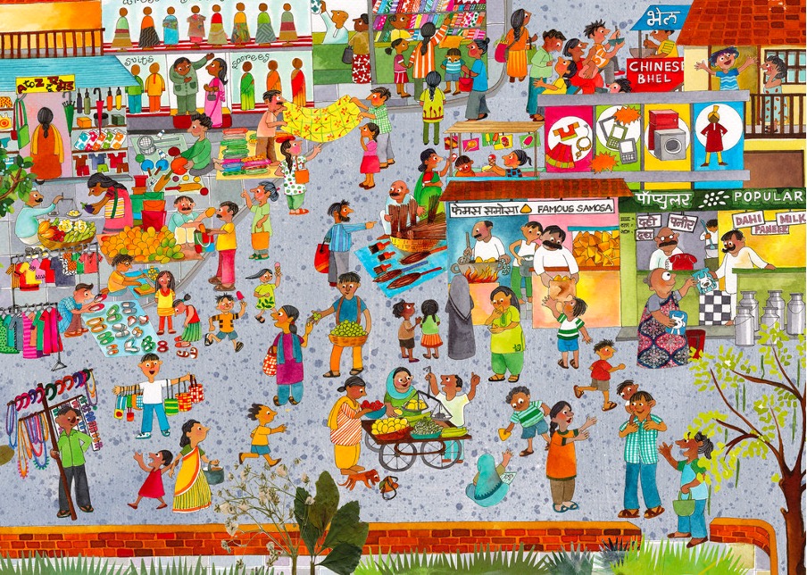 Sometimes, pages densely populated with illustrations, for instance, intended to show a diverse city in Deepa Balsavar’s Nani’s walk to the park, can be navigated with a clearly identifiable character such as the grandmother in a distinctive Ajrakh sari in each page guiding movement across the page (Figure 03). These devices help in drawing the child’s attention across the page and to the next, carrying the story forward.