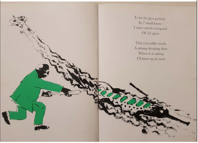 Humor in the form of slapstick action often finds a space for engagement in picture books. Anushka Ravishankar’s Catch that crocodile is a good example. This classic, illustrated by Pulak Biswas, plays with the placement, size and movement of the text along with incongruous movements by characters, and outsized objects like giant syringes. It is visually rich, with cinematic action sequences (Figure 04). Ashok Rajagopalan’s Gajapati Kupapati series is a great favorite with children. This is often due to the extra dose of action experienced by the central character, an elephant. Animal characters figure significantly in many picture books.