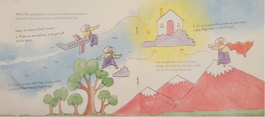 Picture books hold death, loss, gender and disability easily among their pages in a manner that children can relate to, as they encounter these facts of life and living. Gone grandmother by Chatura Rao and Krishna Bala Shenoi, explores a child’s meaning-making process of losing her grandparent in a gentle, humorous manner. At the same, it locates this firmly in the child’s world, as shown by the ideas that spring out of her in the illustrations (Figure 06).