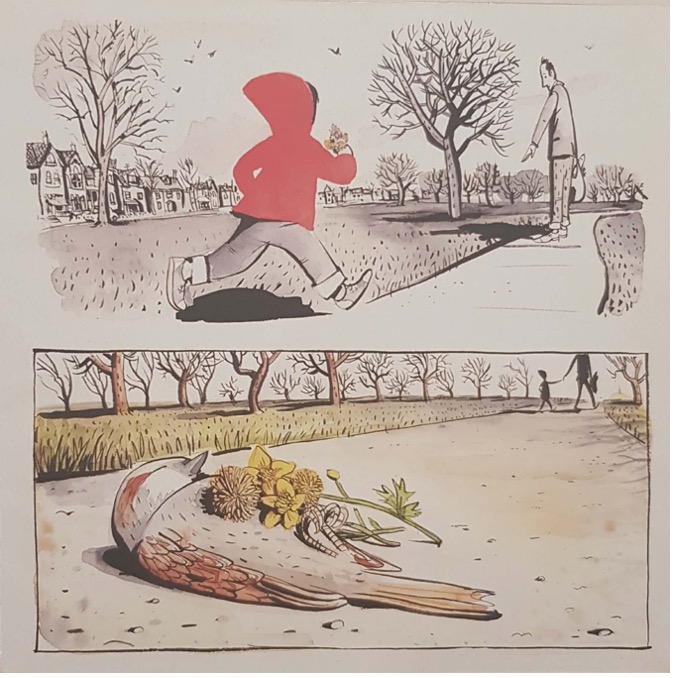 Figure 07: A child sharing flowers with a dead sparrow and a sleeping man in Footpath flowers (2016).